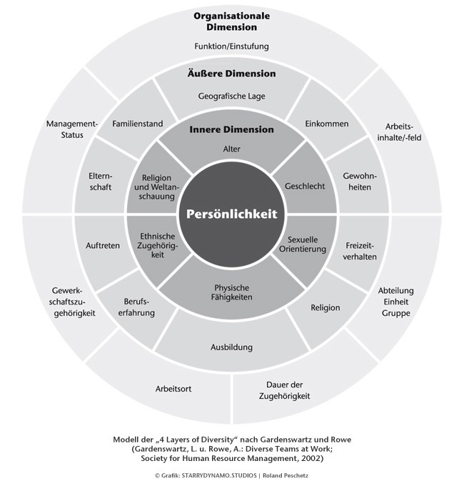 Vielfaltsmanagement resp. Diversity Management beinhaltet ein gut geführtes Personalwesen, welches die Vielfalt seiner Mitarbeitenden im Arbeitsalltag aufnimmt. Im Kern steht immer die PERSÖNLICHKEIT. Die Vielfalt ist durch mehrere Dimensionen definiert (siehe Grafik). Die Checkliste fokussiert auf das Merkmal ethnische Zugehörigkeit. Als Ethnie gilt eine Gruppe von Menschen, die sich durch verschiedene gemeinsame Eigenschaften (Sprache, Kultur, Tradition, Religion, Gebräuche etc.) verbunden fühlt.